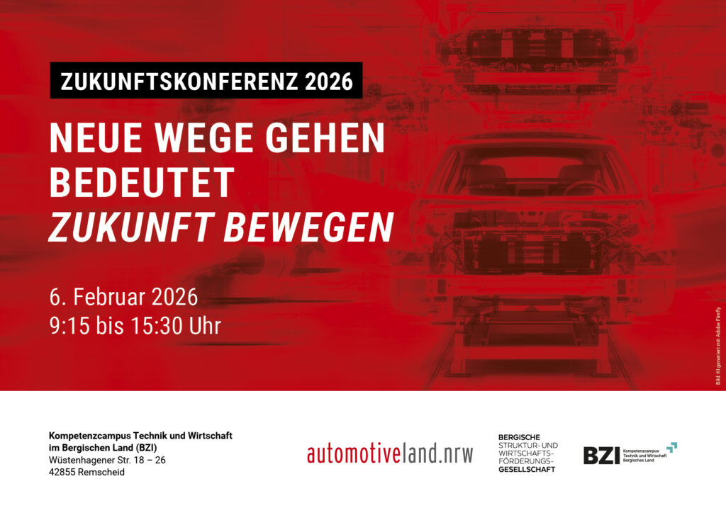 NEUE WEGE GEHEN BEDEUTET ZUKUNFT BEWEGEN automotiveland.nrw und die Bergische Struktur- und Wirtschaftsförderungsgesellschaft mbH laden Sie herzlich zur Zukunftskonferenz am 6. Februar 2026, 9:15 bis 15:30 Uhr ein. Unter dem...